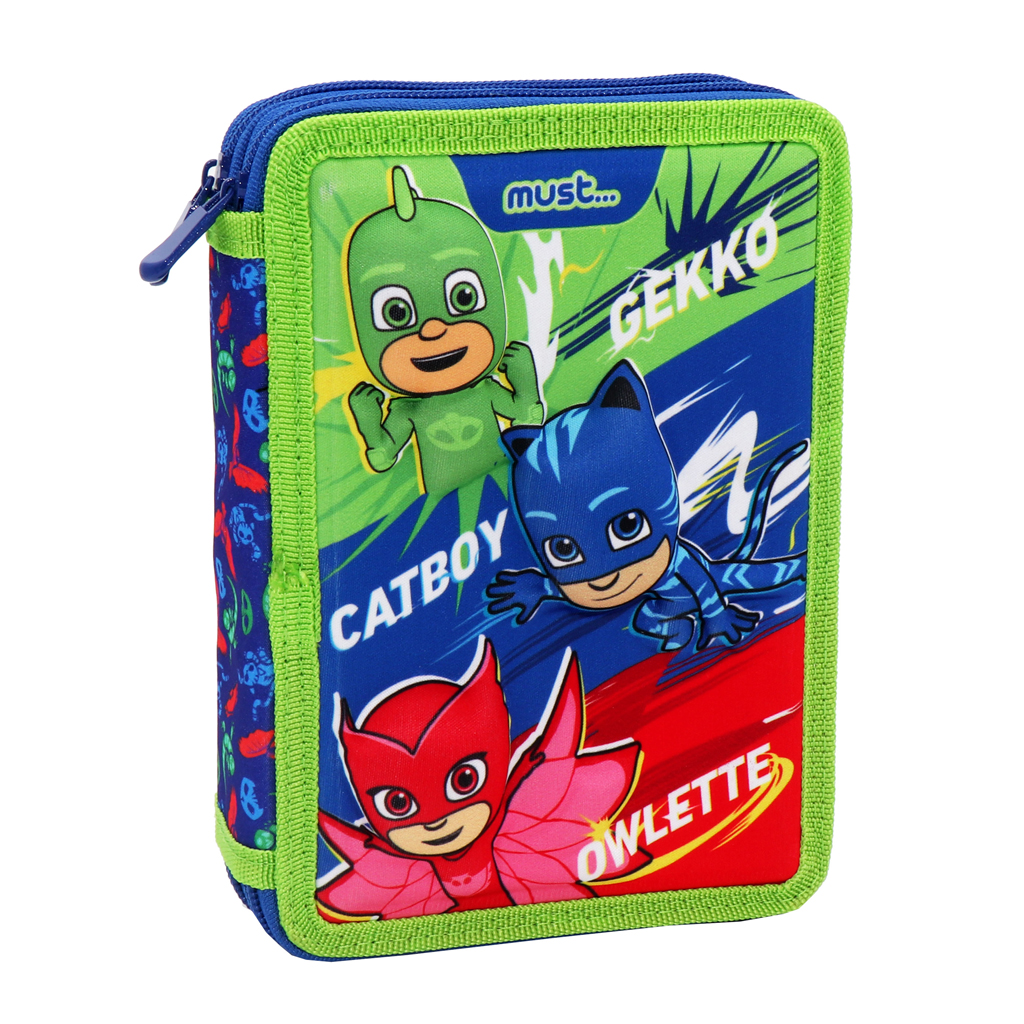 Училишната футрола PJ Masks ги има сите потребни училишни материјали и нуди соодветна организација, безбеден транспорт и складирање на целиот училиштен материјал на училиште. Димензии: 15x21x5 cm. Материјал: Полиестер. Училишната футрола содржи пенкало, молив, гума, гума, линијари, боички и маркери. Издржливи патенти