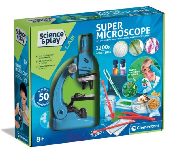 Детскиот микроскоп е лесен за употреба за учење и идеален за млади научници кои сакаат да го истражуваат светот одблизу. Со неверојатно зголемување до 1200x, можете да откриете детали кои се невидливи со голо око. Сега можете да спроведувате фасцинантни експерименти и да го проучувате неверојатниот микросвет. Потребни се 2 AA батерии