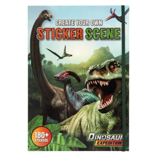 Книга со налепници со повеќе од 180 налепници со диносауруси и 10 слики од пејзажи. Погодно за деца од 3 години.