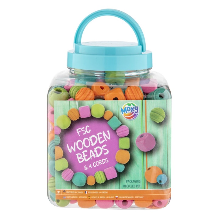 Поддржете ја креативноста и фините моторни вештини на децата со прекрасни дрвени мониста во разни бои и форми. Овој сет содржи 375 грама дрвени мониста сертифицирани од FSC и 4 еластични врвки за врзување, благодарение на кои дури и децата можат да создадат свои ѓердани, нараквици или други украси. Спакувано во практичен транспарентен сад со рачка за лесно складирање и транспорт. Одличен подарок за мали креативци од 3 години.