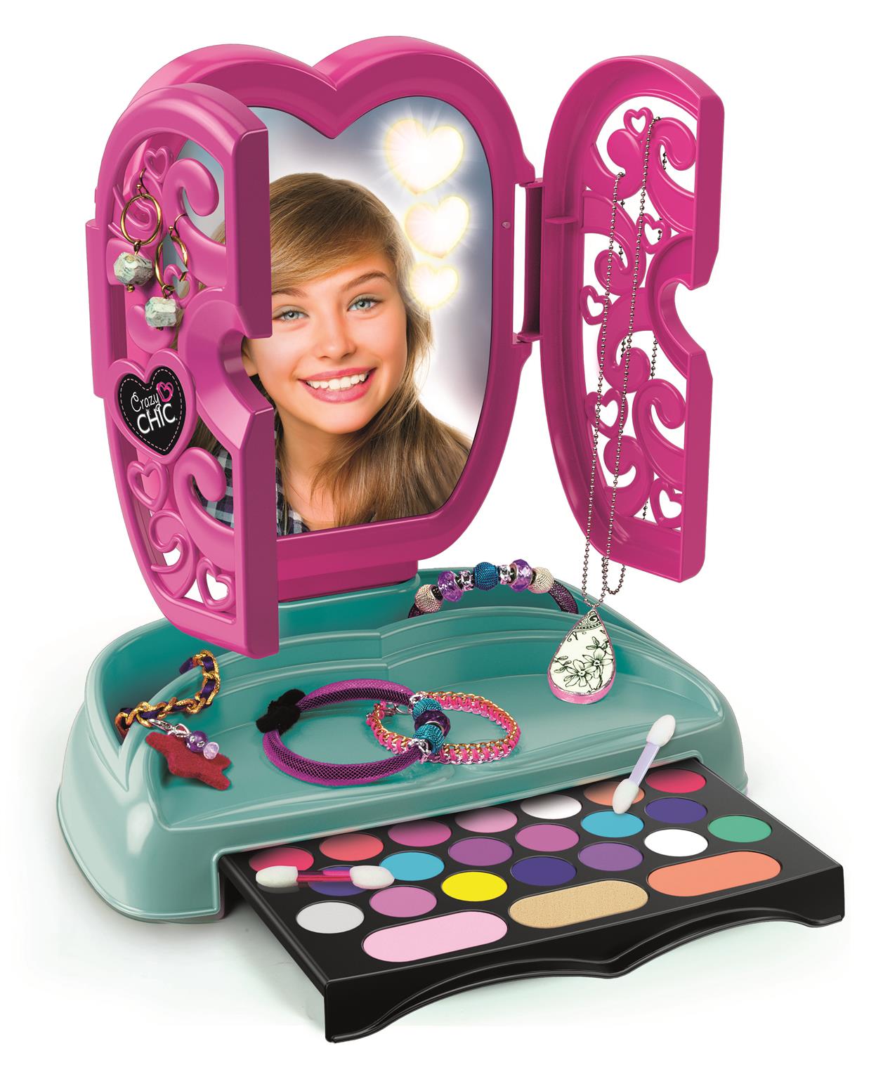 Префинет организатор за шминка со „многу шик“ огледални светла во модерен стил, за создавање шминка како вистински шминкер. Организаторот за шминка содржи богат сет на козметика со сјаеви за усни, сенки за очи и подлога. А за да креирате шминка исто како вашата мајка, вклучени се и апликатор и сунѓерче. Светлата се вклучуваат кога ќе се отвори огледалото за да се создаде вистинската атмосфера и да се направат моментите на игра уште попријатни и попривлечни. Шминката лесно се отстранува со вода и е направена со тестирани нетоксични материјали кои се целосно безбедни.