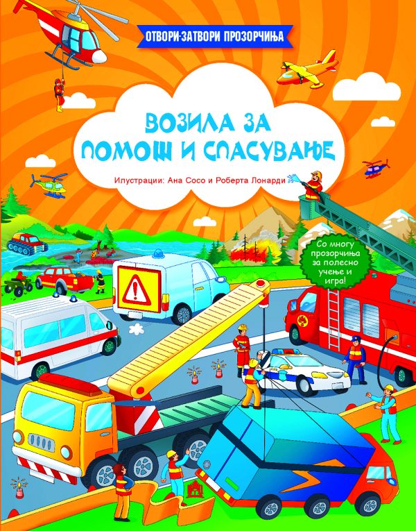 Прочитај ја оваа фантастична книга и дознај се за возилата за помош и сасување! Отвори ги прозорците и откриј многу интересни податоци за противпожарните возила и за спасувачките возила во воздух и на вода. Научи кое возило за каква ситуација се користи!